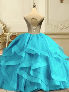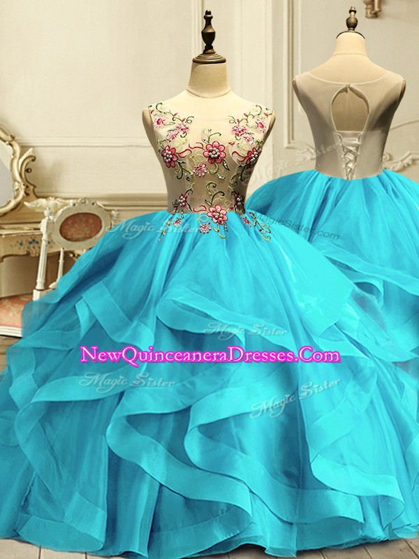 Cute Aqua Blue Lace Up Scoop Appliques and Ruffles Sweet 16 Dresses Organza Sleeveless