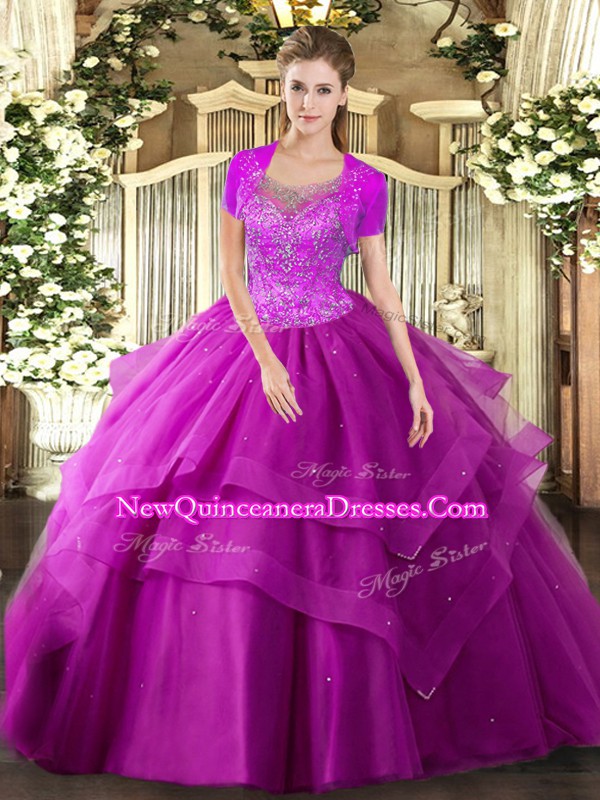 Cute Fuchsia Ball Gowns Tulle Scoop Sleeveless Beading and Ruffles Floor Length Clasp Handle Quinceanera Dress