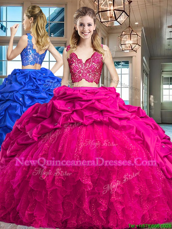 $ 242.42Dazzling Fuchsia V-neck Neckline Lace and Ruffles and Pick Ups Quinceanera Gowns Sleeveless Zipper