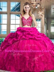 Dazzling Fuchsia V-neck Neckline Lace and Ruffles and Pick Ups Quinceanera Gowns Sleeveless Zipper