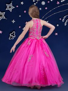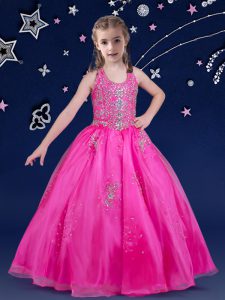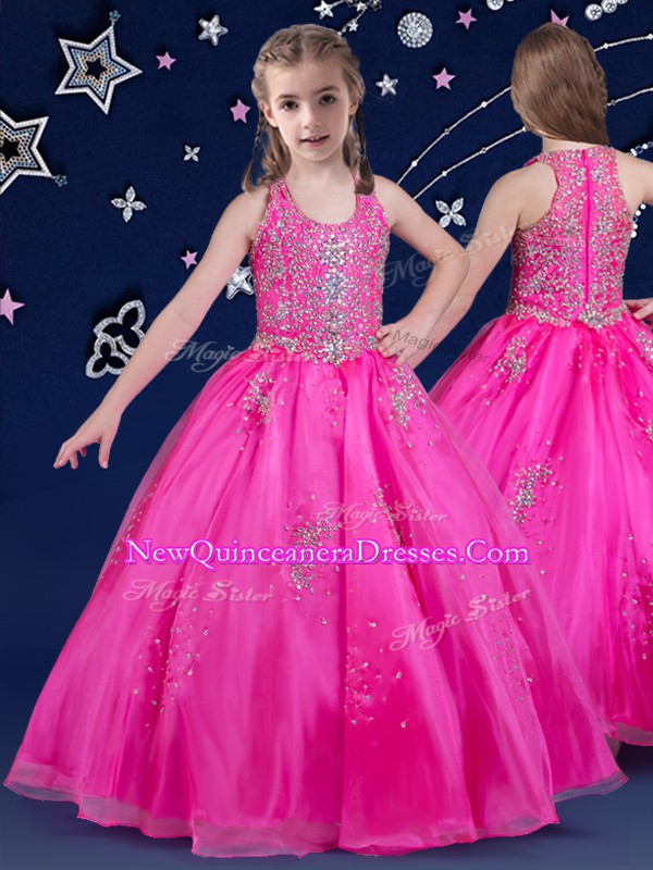 Scoop Hot Pink Sleeveless Floor Length Beading Zipper Little Girls Pageant Gowns