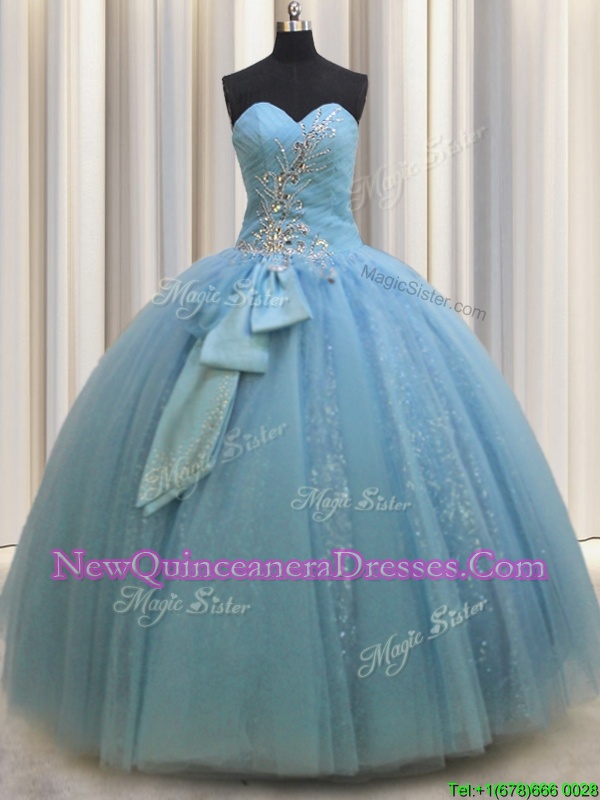 Dazzling Sequins Bowknot Floor Length Ball Gowns Sleeveless Baby Blue Quinceanera Dresses Lace Up