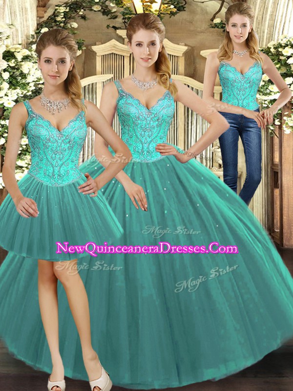 Dazzling Turquoise Sleeveless Floor Length Beading Lace Up Quinceanera Dresses
