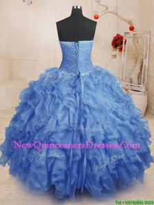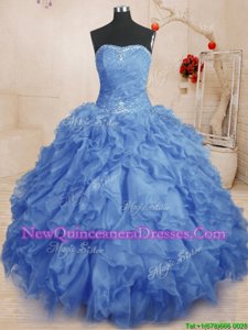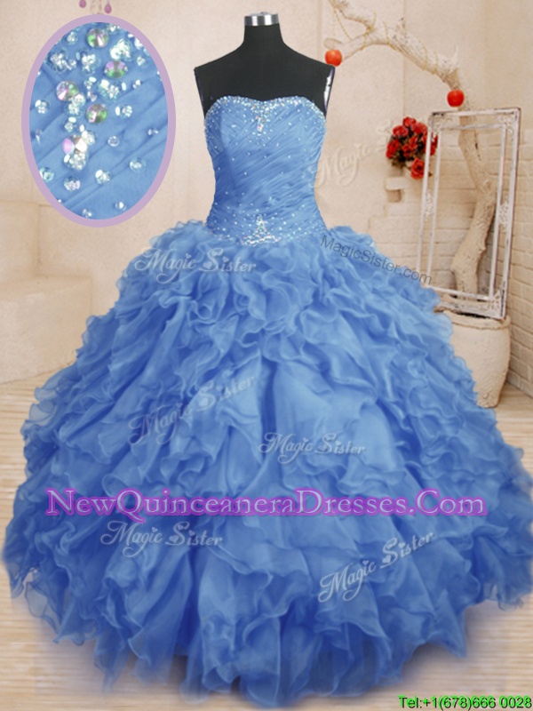 Decent Blue Sleeveless Beading and Ruffles and Ruching Floor Length Sweet 16 Dresses