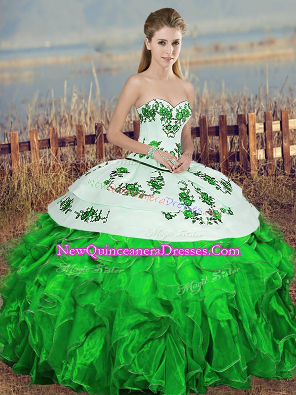 Designer Green Sweet 16 Quinceanera Dress Military Ball and Sweet 16 and Quinceanera with Embroidery and Ruffles and Bowknot Sweetheart Sleeveless Lace Up