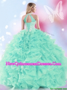 Discount Halter Top Beaded and Ruffled Quinceanera Dress in Apple Green