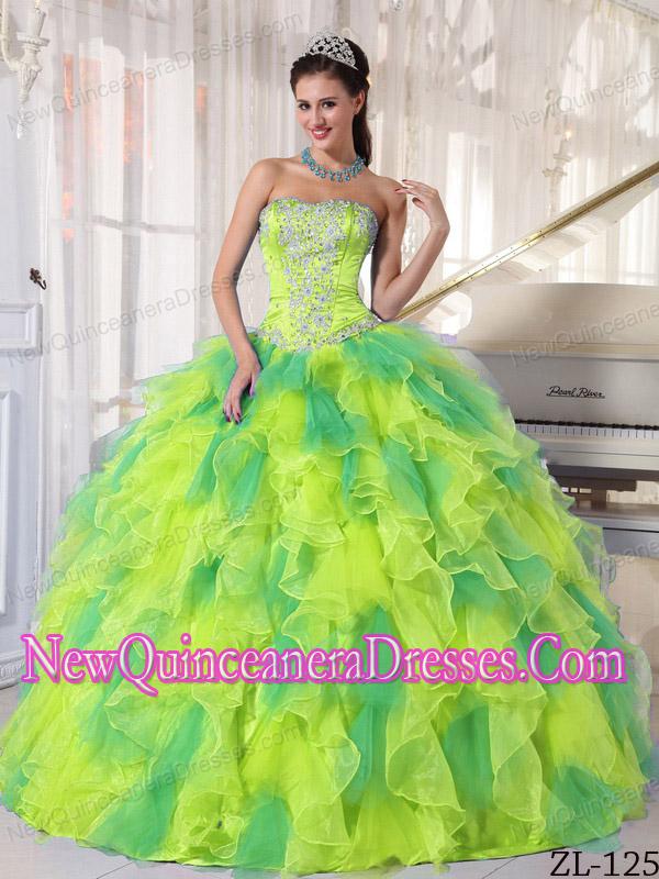 Cheap Ball Gown Strapless Organza Quinceanera Dress with Appliques and Ruffles