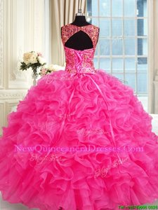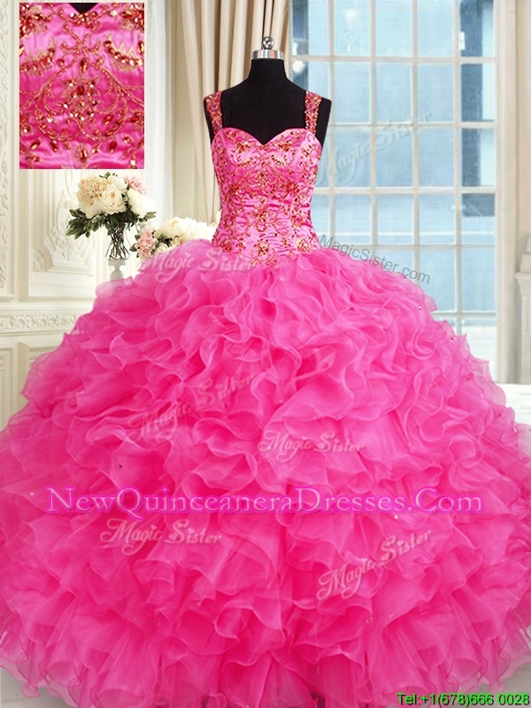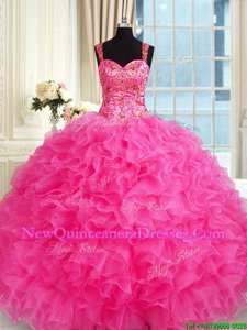 Dynamic Ball Gowns Quince Ball Gowns Hot Pink Straps Organza Sleeveless Floor Length Lace Up