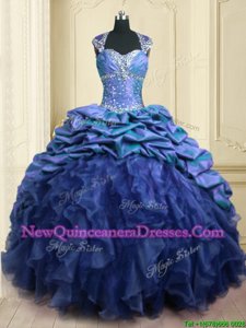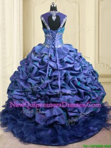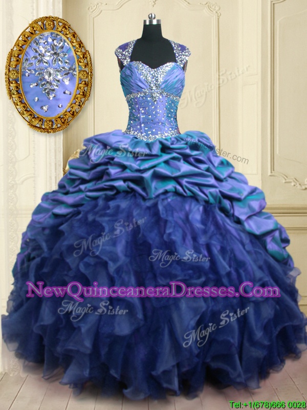 Dynamic Purple Ball Gowns Sweetheart Cap Sleeves Organza and Taffeta With Brush Train Lace Up Beading and Ruffles and Pick Ups Sweet 16 Dresses