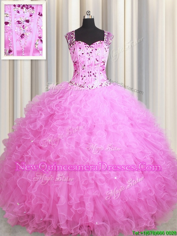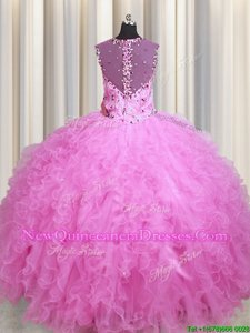 Dynamic See Through Zipper Up Floor Length Zipper Sweet 16 Quinceanera Dress Rose Pink and In for Military Ball and Sweet 16 and Quinceanera withBeading and Ruffles
