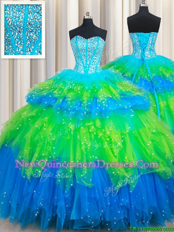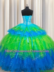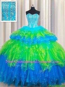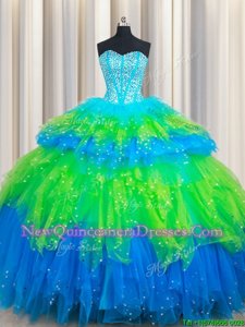 Edgy Multi-color Ball Gowns Tulle Sweetheart Sleeveless Beading and Ruffled Layers Floor Length Lace Up 15th Birthday Dress