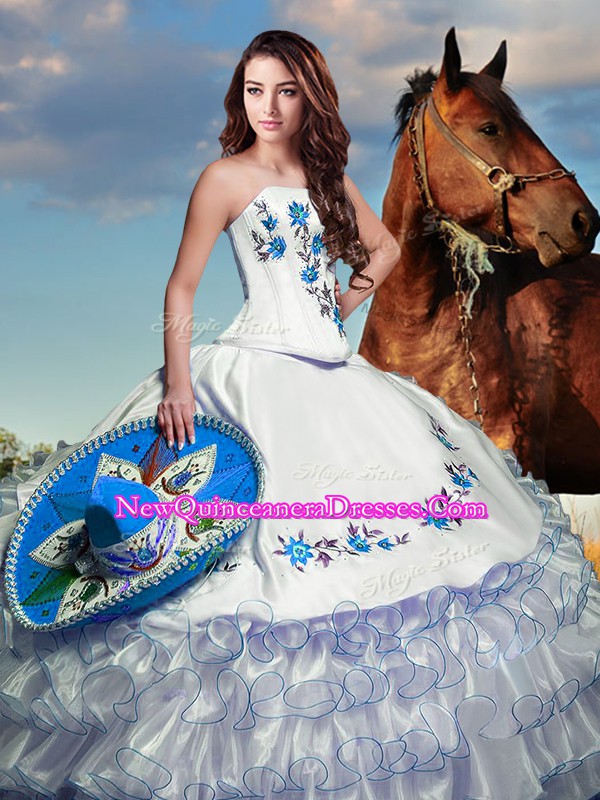 Floor Length White Quinceanera Gowns Organza Sleeveless Embroidery and Ruffled Layers