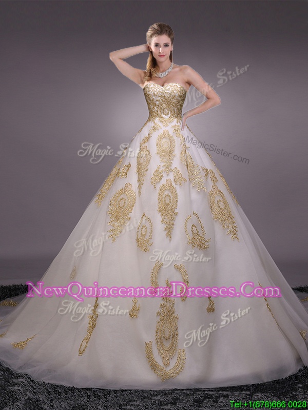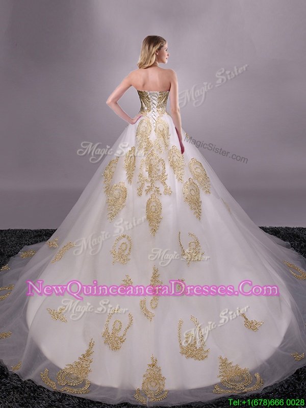 Edgy With Train Lace Up Vestidos de Quinceanera White and In for Military Ball and Sweet 16 and Quinceanera withAppliques Brush Train