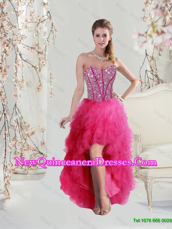 Elegant 2015 High Low Sweetheart Beaded and Ruffles Dama Dresses in Hot Pink
