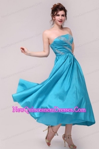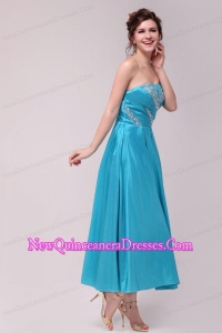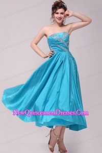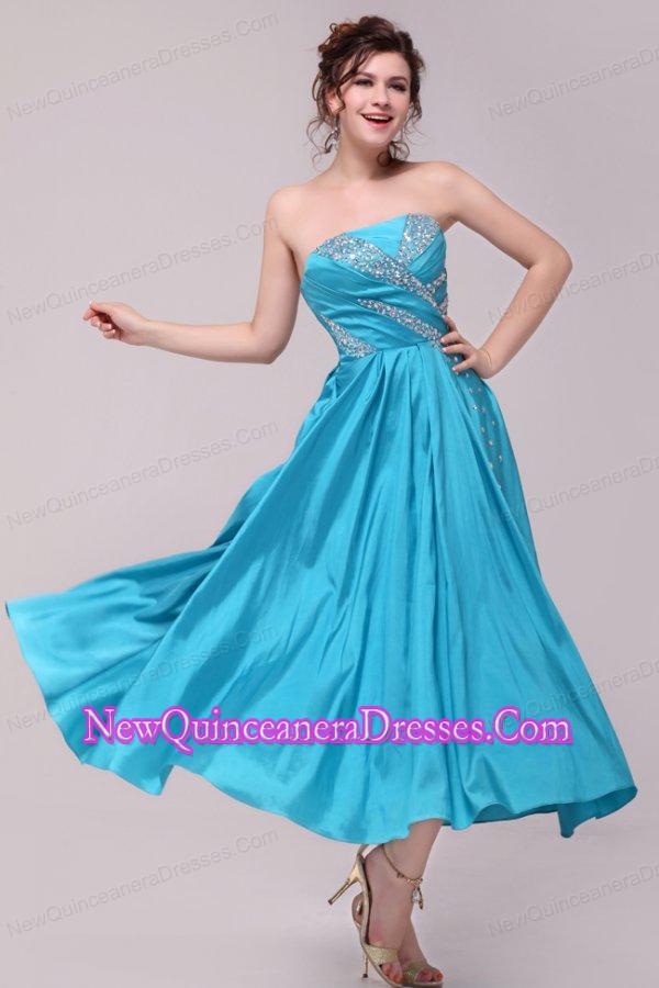 Elegant Aqua Blue A-Line Strapless Taffeta Beading Ankle -length Dresses for Dama