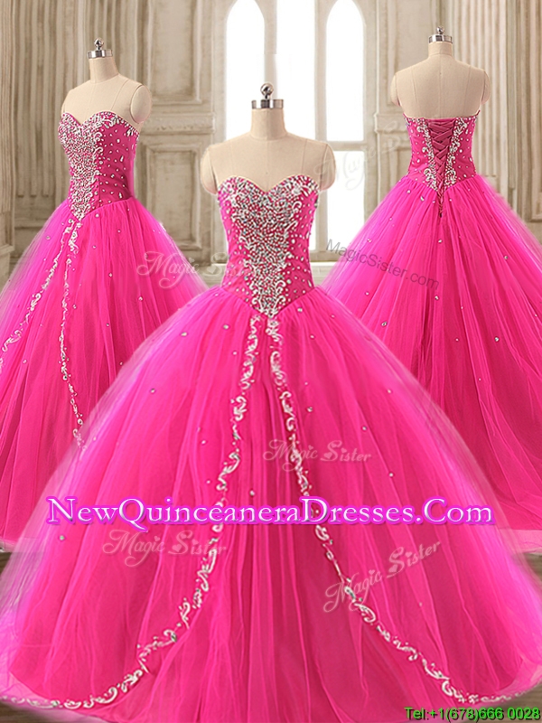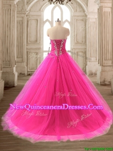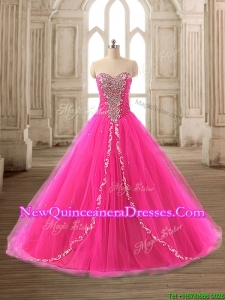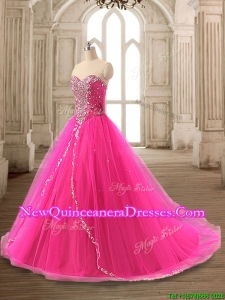 Elegant Beaded Hot Pink Sweet 16 Gown with Brush Train
