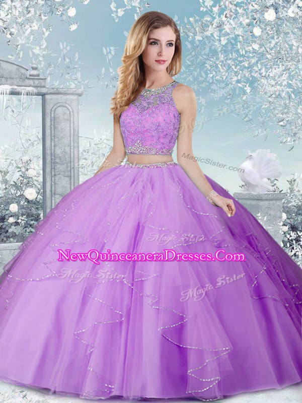 Elegant Floor Length Lavender Sweet 16 Dresses Tulle Sleeveless Beading