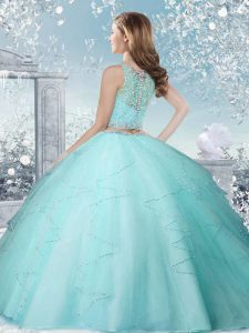 Scoop Sleeveless Sweet 16 Dresses Floor Length Beading Aqua Blue Tulle