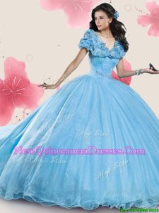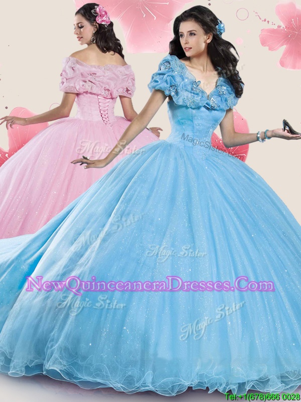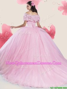 Elegant Off the Shoulder Cap Sleeves Court Train Lace Up With Train Sequins and Bowknot Ball Gown Prom Dress