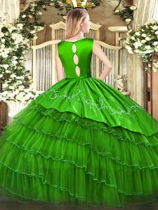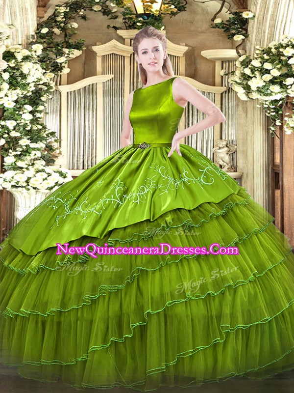 Excellent Olive Green Lace Up Quince Ball Gowns Embroidery and Ruffled Layers Sleeveless Floor Length