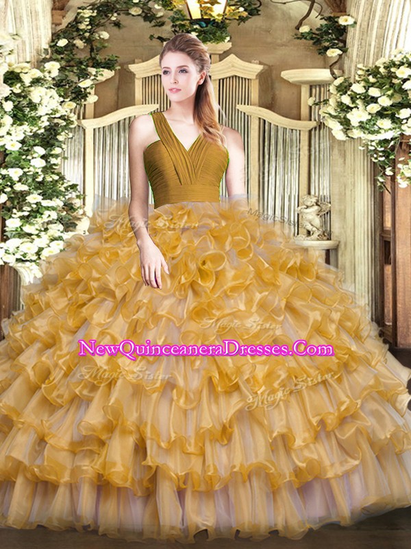 Exceptional Brown Zipper V-neck Ruffled Layers Ball Gown Prom Dress Organza Sleeveless