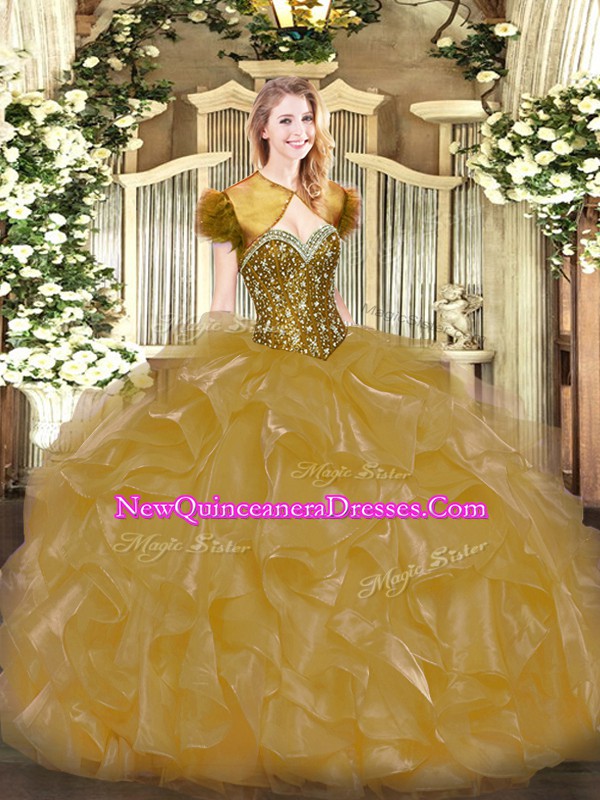 Exceptional Floor Length Lace Up Quince Ball Gowns Gold for Military Ball and Sweet 16 and Quinceanera with Beading and Ruffles