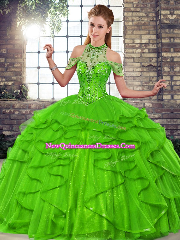 Exceptional Halter Top Sleeveless Lace Up 15th Birthday Dress Green Tulle