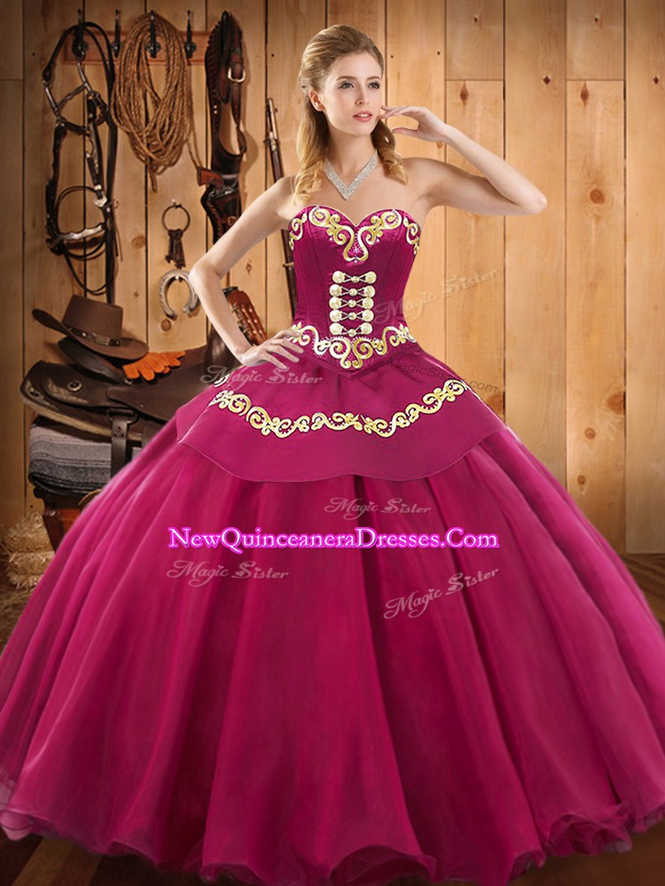 $ 166.91Exquisite Fuchsia Tulle Lace Up Sweetheart Sleeveless Floor Length Quinceanera Dresses Ruffles