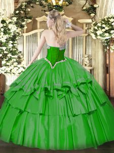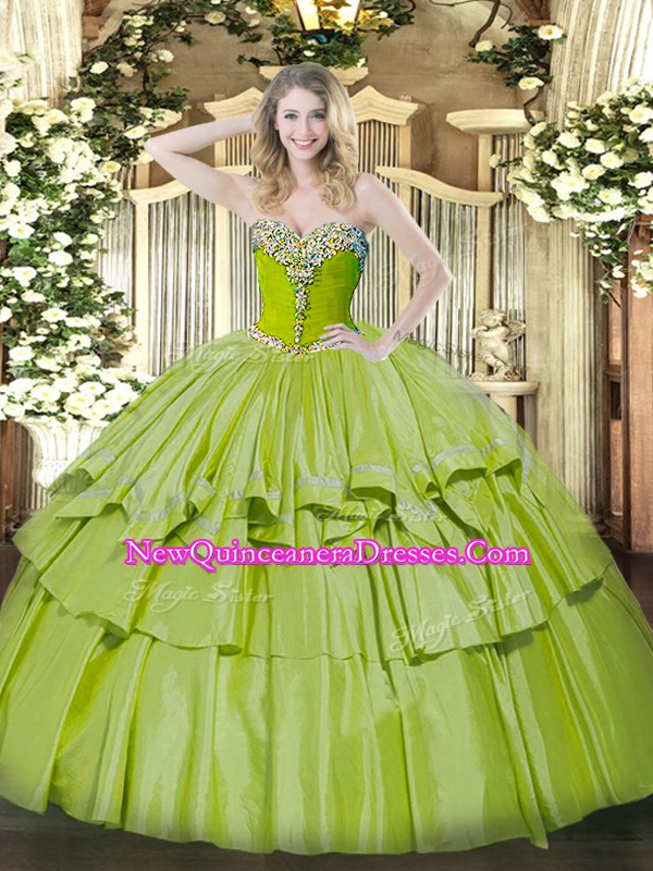 Exquisite Olive Green Ball Gowns Sweetheart Sleeveless Organza and Taffeta Floor Length Lace Up Beading and Ruffled Layers Ball Gown Prom Dress