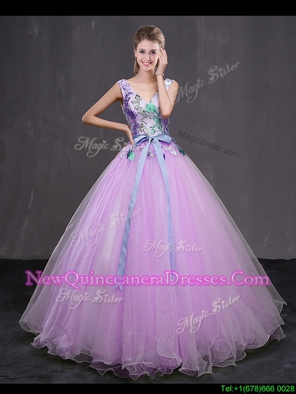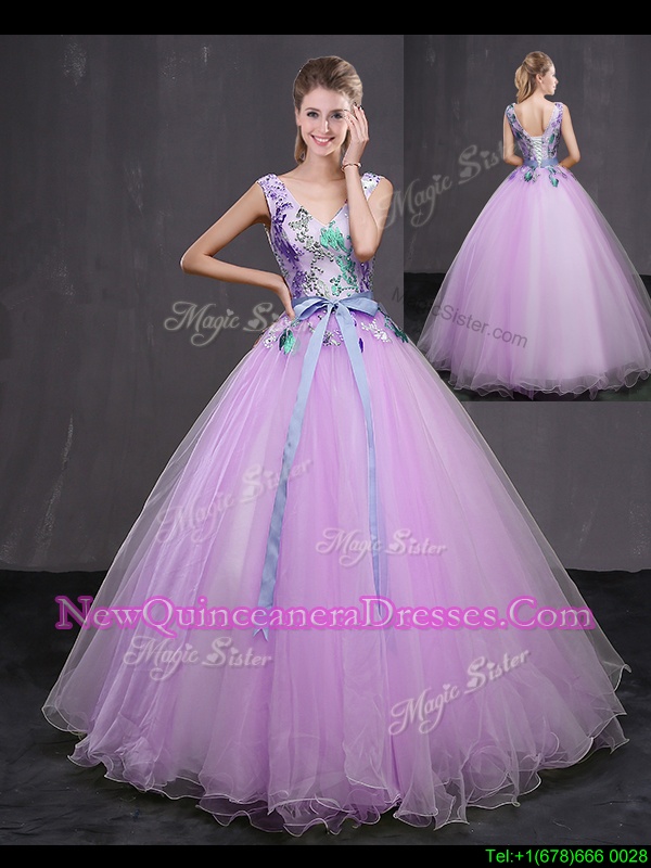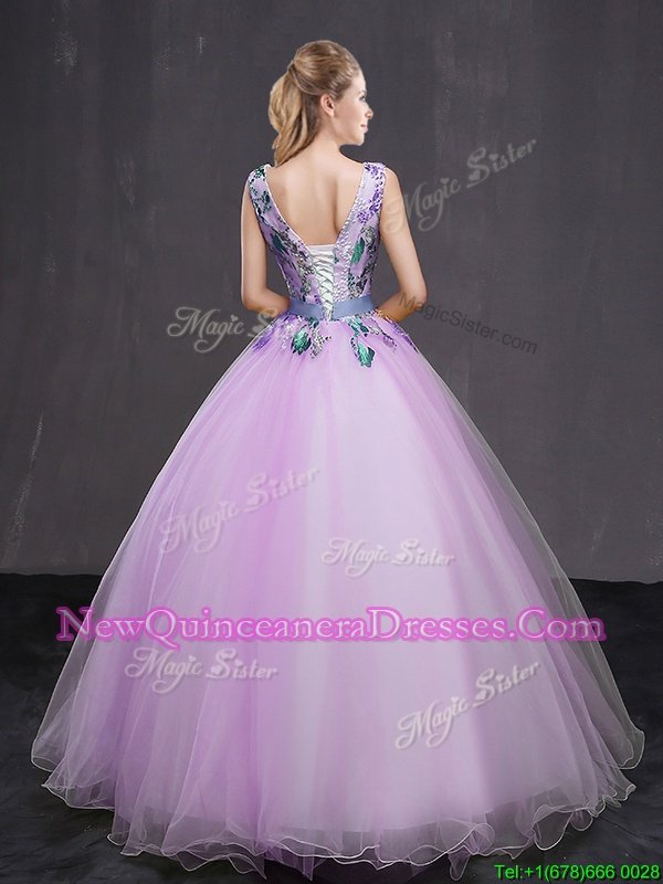 Extravagant Floor Length Lace Up Quinceanera Dress Lilac and In for Military Ball and Sweet 16 and Quinceanera withAppliques and Belt