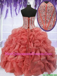 Extravagant Four Piece Ball Gowns 15th Birthday Dress Coral Red Sweetheart Organza Sleeveless Floor Length Lace Up