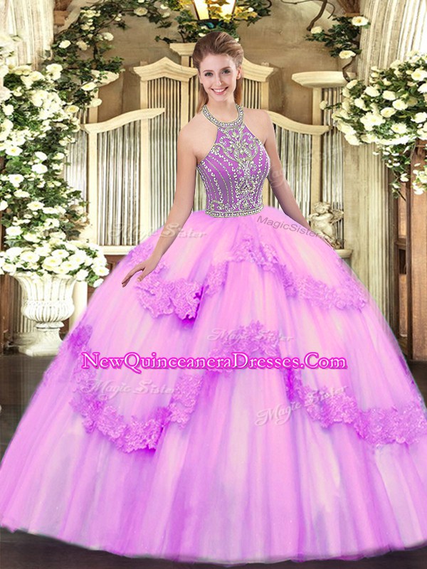 Eye-catching Ball Gowns Ball Gown Prom Dress Lilac Halter Top Tulle Sleeveless Floor Length Lace Up