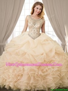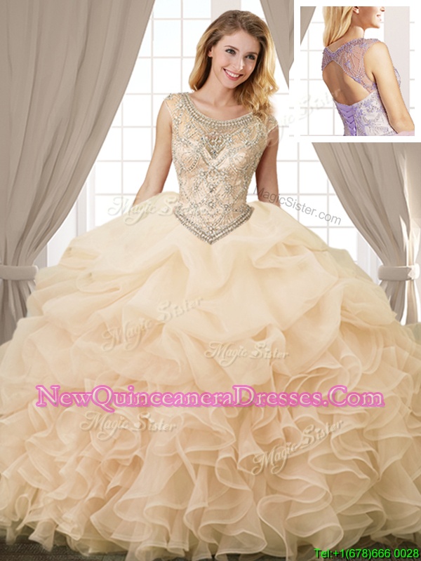 Fantastic Scoop Champagne Lace Up Sweet 16 Dresses Beading and Ruffles and Pick Ups Sleeveless Floor Length