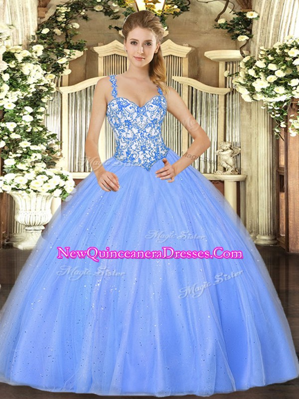 Fashion Baby Blue Organza Lace Up Straps Sleeveless Floor Length Sweet 16 Quinceanera Dress Beading and Appliques