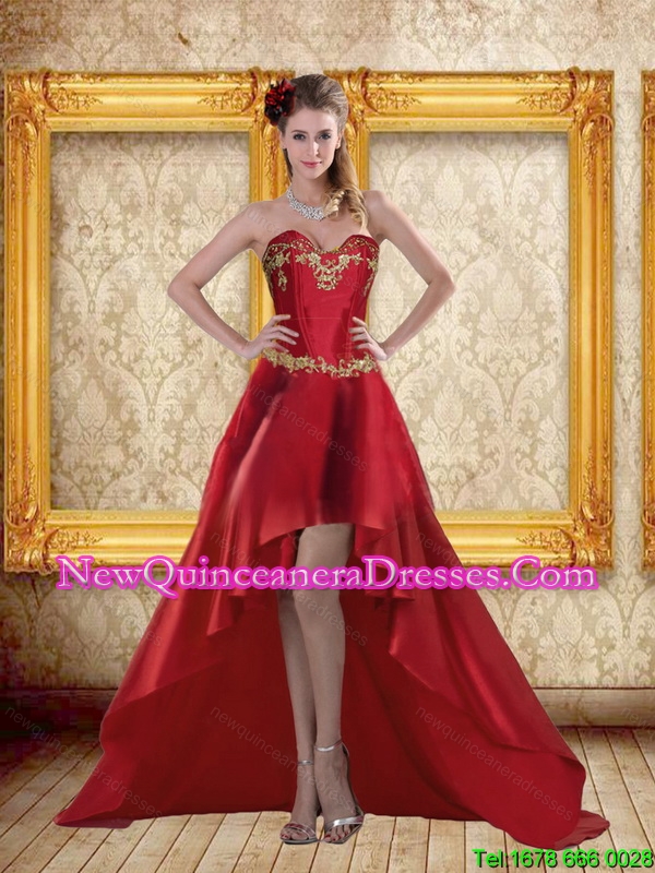 Fashionable 2015 High Low Sweetheart Wine Red Beading Dama Dresses