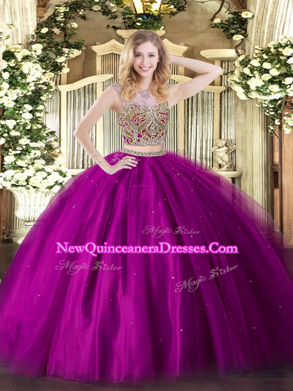 Fashionable Floor Length Two Pieces Sleeveless Fuchsia Quince Ball Gowns Lace Up