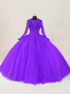 Fashionable Long Sleeves Tulle Floor Length Zipper Quinceanera Gowns in Purple with Lace and Appliques