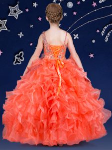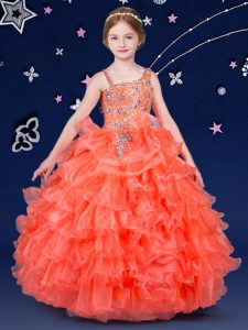 Fashionable Orange Organza Lace Up Little Girl Pageant Gowns Sleeveless Floor Length Beading and Ruffled Layers