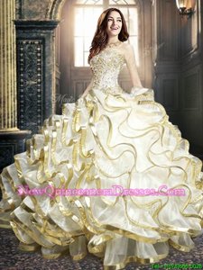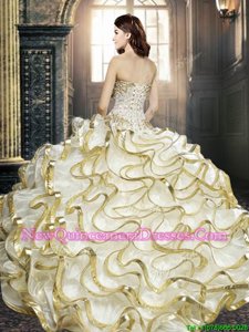 Fashionable White and Gold Ball Gowns Beading and Ruffles and Sequins Sweet 16 Quinceanera Dress Lace Up Organza Sleeveless