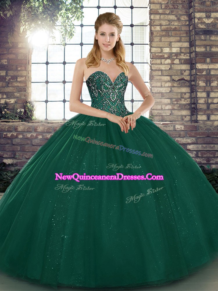 Fine Floor Length Lace Up Quinceanera Dress Peacock Green for Military Ball and Sweet 16 and Quinceanera with Beading