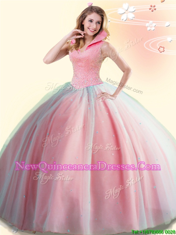 Fine High-neck Sleeveless Backless Ball Gown Prom Dress Watermelon Red Tulle