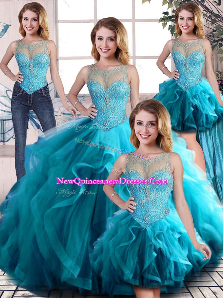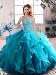 Fine Scoop Sleeveless Lace Up 15 Quinceanera Dress Aqua Blue Tulle