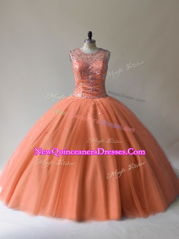 Fitting Orange Sleeveless Floor Length Beading Lace Up 15th Birthday Dress