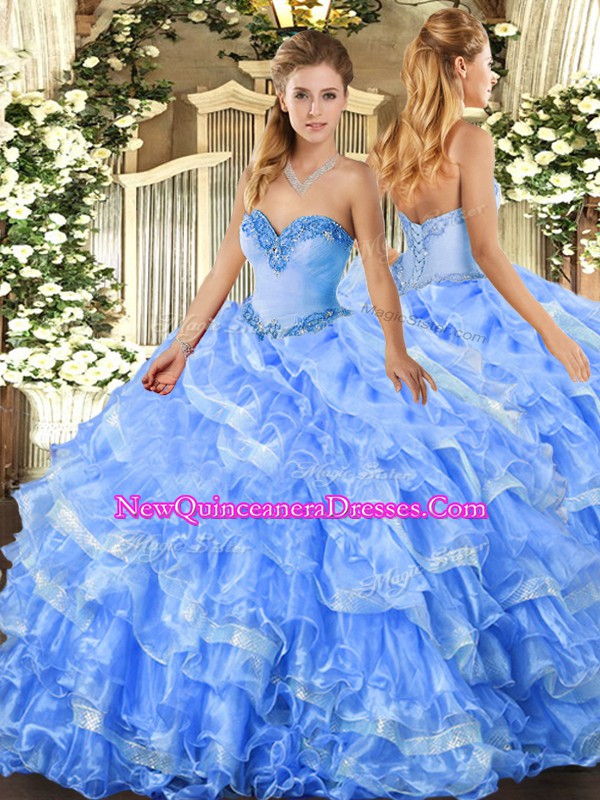 Sleeveless Floor Length Beading and Ruffles Lace Up Sweet 16 Quinceanera Dress with Aqua Blue