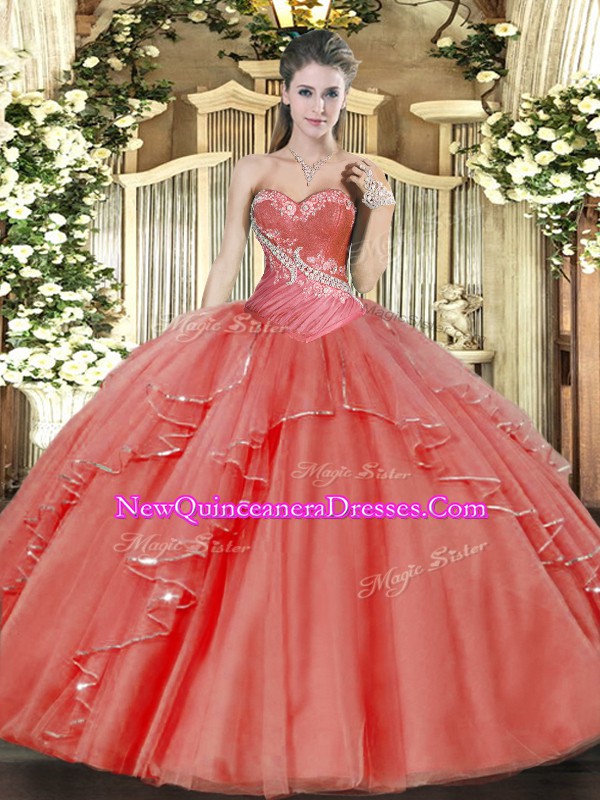 Flirting Floor Length Ball Gowns Sleeveless Coral Red Ball Gown Prom Dress Lace Up