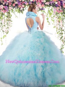 Flirting Sleeveless Tulle Floor Length Backless Vestidos de Quinceanera inBaby Blue withBeading and Ruffles