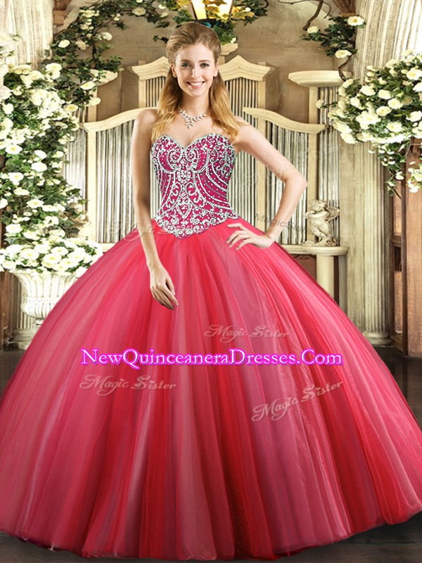 Floor Length Ball Gowns Sleeveless Coral Red Ball Gown Prom Dress Lace Up
