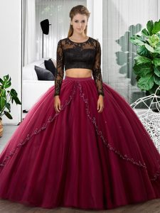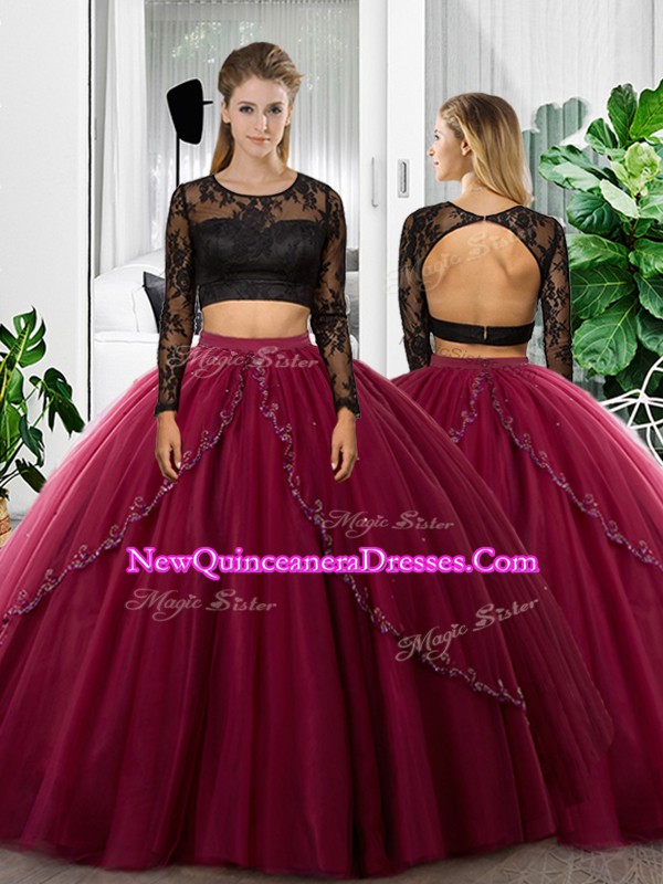 Floor Length Fuchsia Ball Gown Prom Dress Tulle Long Sleeves Lace and Ruching