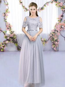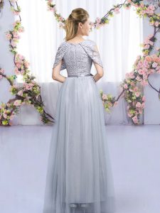 Floor Length Zipper Damas Dress Grey for Wedding Party with Lace and Belt