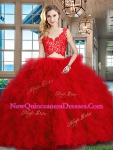 Free and Easy Red Zipper Quince Ball Gowns Lace and Ruffles Sleeveless Brush Train